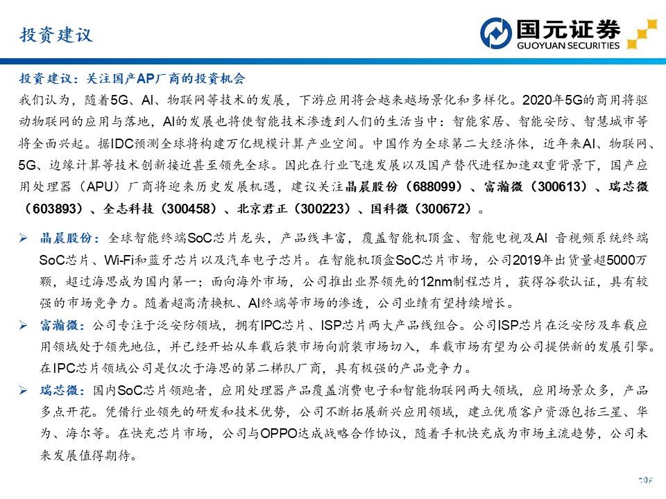 我们认为,随着5G、AI、物联网等技术的发展,下游应用将会越来越场景化和多样化。2020年5G的商用将驱动物联网的应用与落地,AI的发展也将使智能技术渗透到人们的生活当中:智能家居、智能安防、智慧城市等将全面兴起。据IDC预测全球将构建万亿规模计算产业空间。中国作为全球第二大经济体,近年来AI、物联网、5G、边缘计算等技术创新接近甚至领先全球。因此在行业飞速发展以及国产替代进程加速双重背景下,国产应用处理器(APU)厂商将迎来历史发展机遇,建议关注晶晨股份(688099)、富瀚微(300613)、瑞芯微(603893)、全志科技(300458)、北京君正(300223)、国科微(300672)。