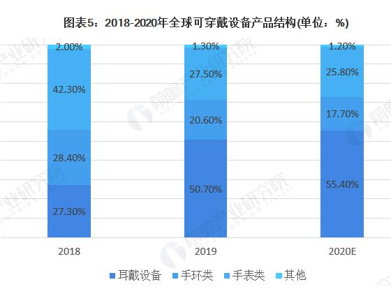 从可穿戴设备产品结构来看,2018-2019年,耳戴设备市场份额大幅上升,2019年占比突破50%,达到50.7%;手环、手表类产品份额有所下滑,2019年占比分别为20.6%和27.5%。