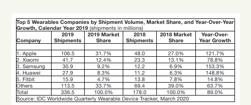 2019全年前五大可穿戴设备公司数据