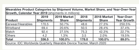 2019年的智能可穿戴设备市场能取得如此爆炸式的增长主要来自于真无线耳机、智能手环、智能手表三大类。其中智能手环的2019年出货量为6940万部,较去年的5050万部增长了37.4%,智能手表的2019年出货量为9240万部,较去年的7520万部增长了22.7%。而其中表现最为亮眼的可穿戴耳机2019年出货量为1.705亿部,较去年的4860万部,增长率高达250.5%,令人咋舌。正如IDC可穿戴团队的研究总监雷蒙·T·亚马斯(Ramon T. Llamas)表示:“2019年标志着全球可穿戴设备市场迈出了重要一步。得益于新产品的发布以及越来越多智能手机省去了传统耳机的耳机线,可穿戴耳机增长显著。智能手表和智能手环的表现也不俗,年销售量均创历史新高。”