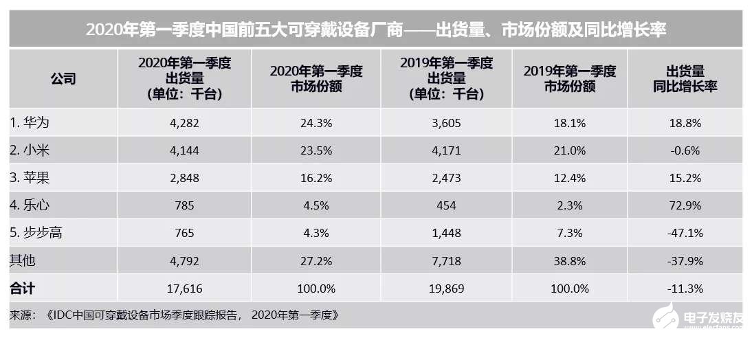 2020年第一季度,排名中国可穿戴设备市场前五的厂商分别为:华为(24.3%)、小米(23.5%)、苹果(16.2%)、乐心(4.5%)、步步高(14.620, 0.02, 0.14%)(4.3%)。
