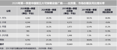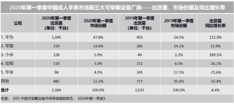 其中,华为凭借出色的渠道运营能力和产品市场号召力,在手表市场上的表现尤其稳健,帮助其逆势增长,跃居中国可穿戴市场第一位。2020年第一季度出货量482.2万台,市场份额24.3%,出货量同比增长18.8%。