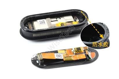 由于手环具有5ATM的防水性,所以在屏幕与后盖间带有防水胶固定,需要加热屏幕与后盖缝隙处,配合撬片将屏幕与后盖分离。