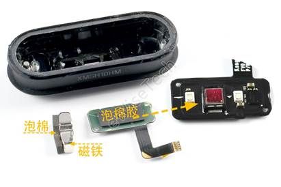 心率传感器软板通过泡棉胶固定在后盖上。磁铁固定在充电接口旁,用于吸附充电器。