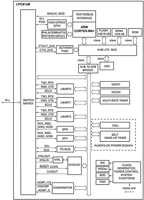 恩智浦LPC81系列图1图:恩智浦的LPC81系列采用模式匹配引擎,以减少CPU活动。零壁虎家族Silicon Labs的集成与周边反射系统类似但更复杂的功能;外设能够与彼此通信,而核心保持在低功率休眠模式。