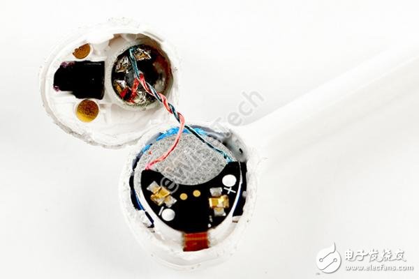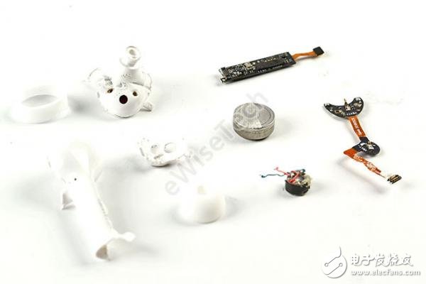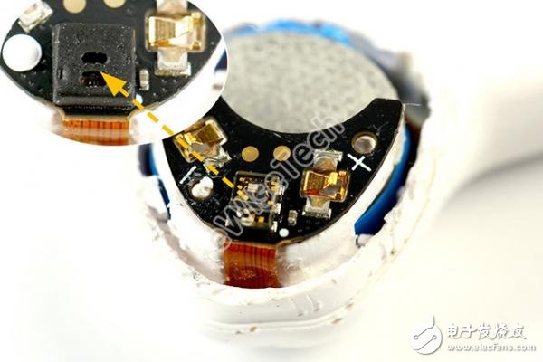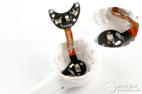 整个耳机并没有使用螺丝,大部分都通过胶固定。内部两块软硬结合板之间通过BTB接口连接,耳机内共有两颗麦克风,都带有保护硅胶套。电池采用的纽扣状的可充电锂电池。由于耳机的防水防尘性,所以在开孔处都采用了防尘网以及防水胶圈等措施。