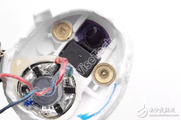导线连接到耳机板的反面,与电池的连接弹片同样位于这一面。使用烙铁断开导线后,可分离动圈单元和主板。