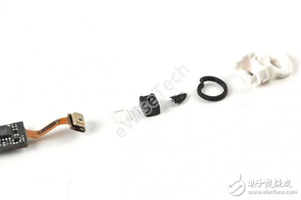 拆出来之后可以看到位于软硬结合板上的麦克风以及硅胶保护套,防水塑料垫片,防尘网,密封圈,塑料外壳。