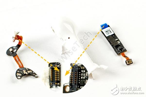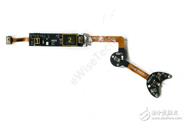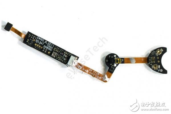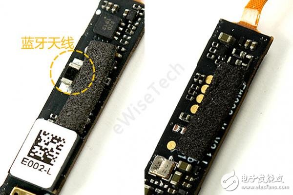 位于电池下方的就是另一块主板,软板折叠在外壳壁上,通过透明点胶固定,软板另一侧延伸到下方蓝牙天线。表面用白色点胶封住。