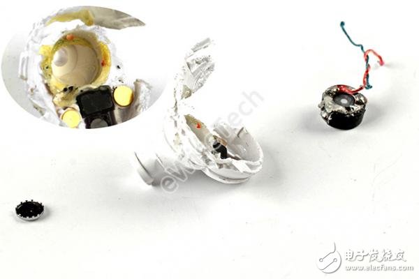 随后要拆解的便是耳壳动圈单元,由于单元外侧点胶过多,只能破坏外壳进行拆解。动圈单元选用黄色的胶固定。