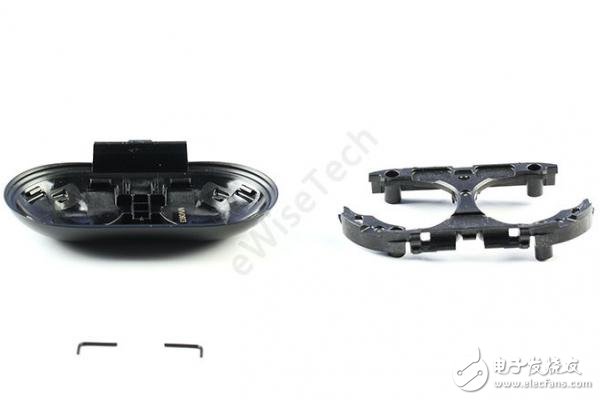 下方使用同样的方法进行拆解。需要注意的是,与上方托盘不同,下方托盘使用了7块磁铁,有一个有LED灯罩,并且在托盘内部贴有黑色双面胶。拆掉下方托盘可以看到内支撑上面的螺丝孔位。