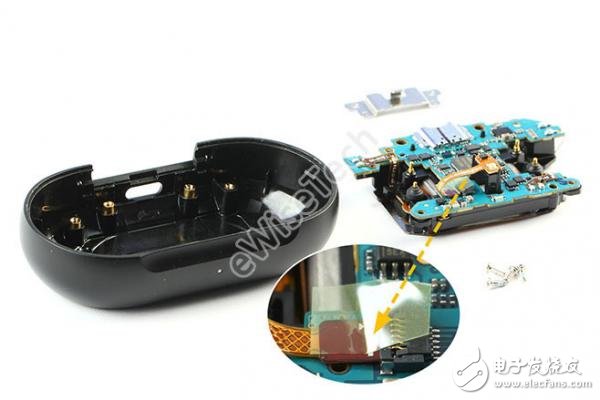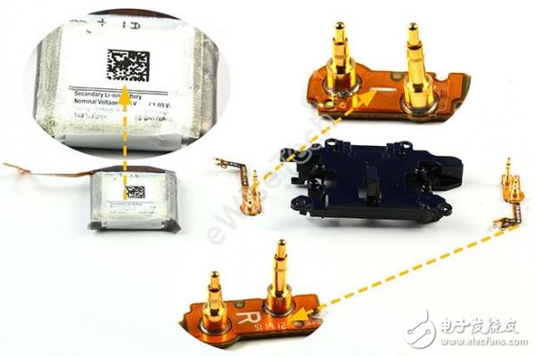 分离无线充电线圈模块,无线充电线圈通过石墨片,泡棉胶,以及电池背部一圈正方形透明双面胶进行固定。充电触点有硅胶帽进行保护。电池软板折叠位于槽内。