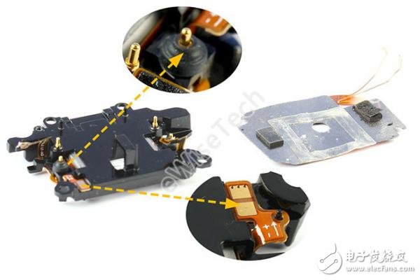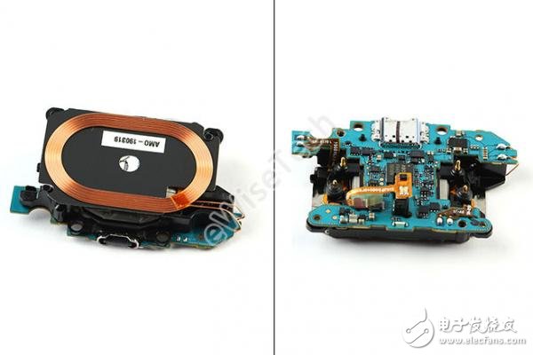 主板一侧贴有无线充电线圈,线圈通过触点与主板连接。
