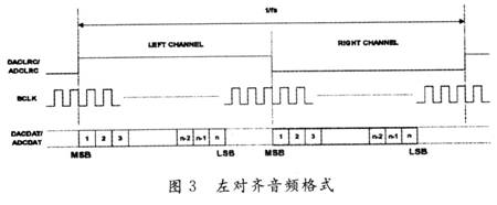 本文采用主模式的左对齐数据格式,左对齐数据格式传输如图3:左对齐格式时,MSB在BCLK的第一个上升沿有效,紧接着是一个ADCLRC或DACLRC传输。