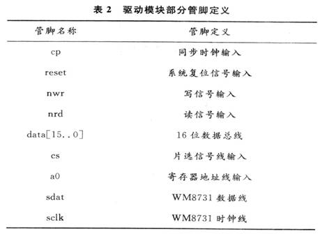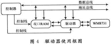 RAM和驱动器一同连接在控制器的数据总线和地址总线上,控制器只需提供少量的控制线即可完成对音频编解码芯片wM8731的控制及数据交换功能。