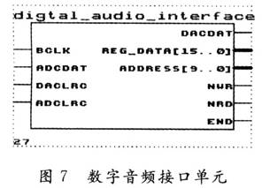 当读入数字音频标志位C1为‘1’,接收WM873l芯片传来的数字音频数据并将其存入外部双口RAM中,当输出数字音频数据标志位C2为‘1’时,将双口RAM中的音频数据发送给wM8731。如图7所示。