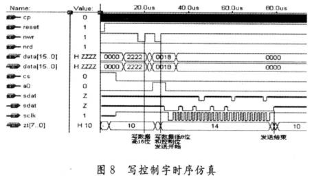 下面给出控制器通过该驱动模块对WM8731写控制字的时序仿真如图8所示。图中各引脚定义如表2所示。