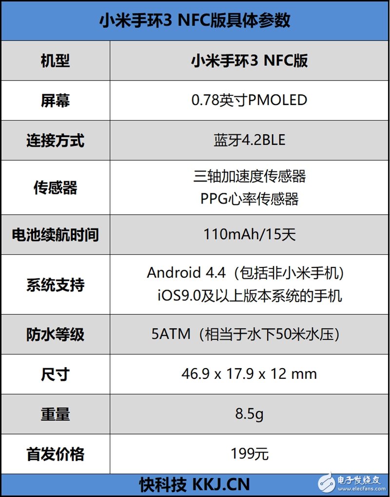 小米手环 3 NFC版外观方面与小米手环3完全一致,优雅的水滴状造型,PPI 高达193 的OLED显示屏;5 ATM 防水、运动副屏、事件提醒以及15天左右的续航样样不缺。