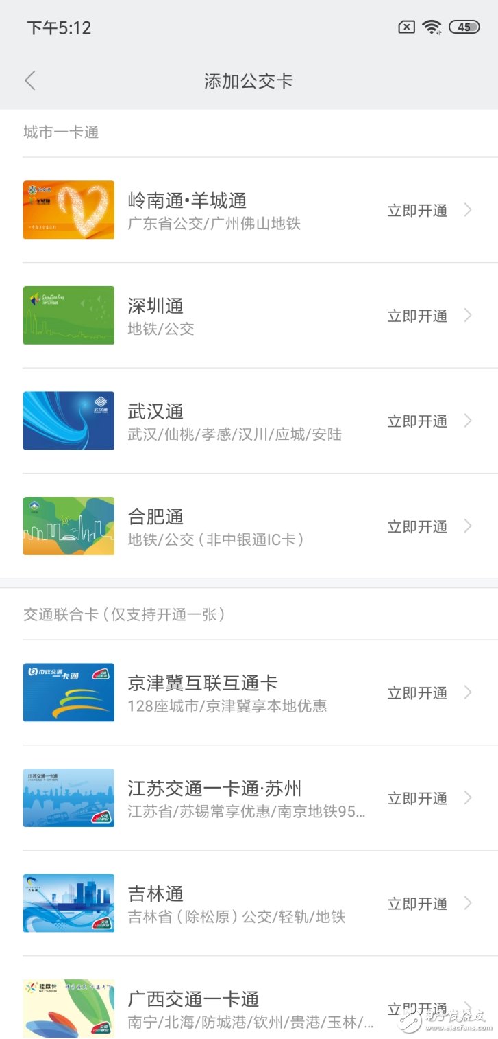点击立即开通,即进入已支持公交卡列表展示页面。