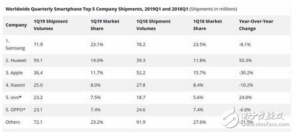 IDC最近发布的2019年第一季度全球智能手机市场的调研报告。数据显示,全球智能手机出货量为 3.108 亿台,同比下降 6.6%。其中排在全球出货量前六位的厂商也大部分处于同比下降的状态,Apple甚至下降超过了 30%。