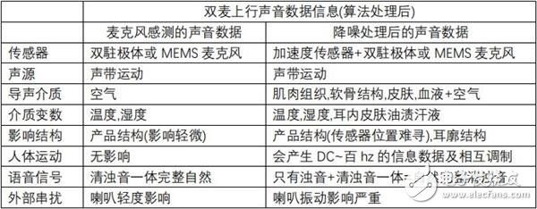 这里整理了一张对照表,以苹果的 TWS 耳机做为参照标准,比较使用 2 种完全不同性质的声传感器所感测到的声音信息数据在处理完降噪问题后要等于 1种声传感器所感测到的声音信息数据,将可能将要面临到多少问题及挑战。