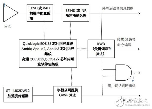 络达、瑞昱、恒玄等芯片产品建议搭配QuickLogic S3、Ambiq Apollo2、 Apollo3 或楼氏 IA-610、IA-611 智能麦克风芯片以达到在高算力低功耗要求下,满足本地唤醒词的功能。