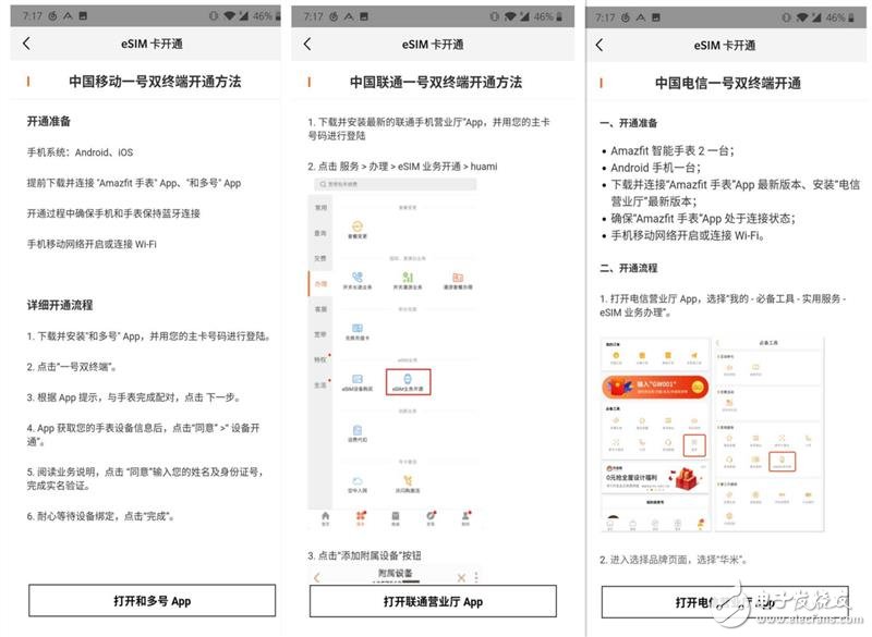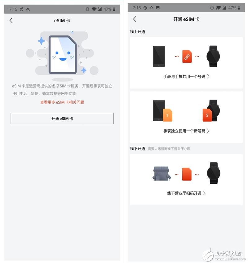 无论是移动、联通还是电信,华米智能手表2e的SIM功能开通、使用都无需实体电话卡。其可以通过内置的eSIM蜂窝网络模块来实现独立通话功能,开通eSIM业务的过程可在手机APP上完成,也可前往线下营业厅扫码开通。
