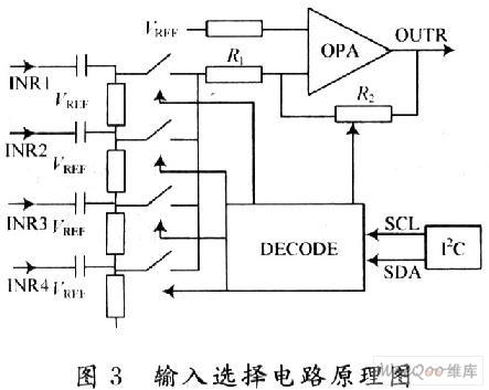 MCU)通过I2C总线向音频处理芯片发送控制数据。音频处理器芯片接收I2C总线传输的数据,通过译码电路控制选择的音源通道开关的开与关,实现输入通道选择的功能。同时根据控制字调节