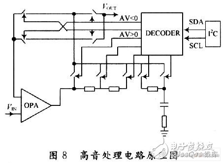 高音部分的频率处理电路主要原理如图8所示,主要通过内部有源运算放大器、交叉开关对、增益控制电阻、外接串连R,C实现高音部分音频信号的频率响应。采用低音