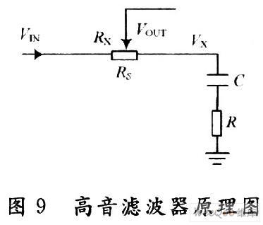 高音处理的滤波器由内部电阻阵列、外接电阻、外接电容组成,电路原理图如图9所示。