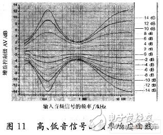 (2)高低音频率响应的测试;通过微处理发送命令使得音频电路处于高低音控制模式,通过改变输入信号的频率,峰峰值设定为100 mV的正弦信号,在不同增益控制级别下测试不同频率信号下的输出信号峰峰值,进而计算该频率和增益级别下的增益。利用测试得到的数据绘制频率响应曲线如图11所示。
