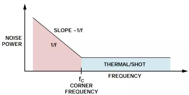 内部噪声有许多来源,各种噪声源都有自己独一无二的特性。内部噪声主要有以下几类:热噪声、1/f噪声、散粒噪声、爆裂或爆米花噪声。图2显示了一个典型器件的噪声如何随频率而变化,以及各类噪声对总噪声的贡献。从1/f区到热区的跃迁点称为转折频率。