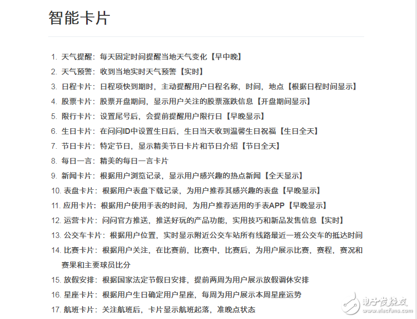 在表盘界面,向右滑动进入语音交互界面,除了语音助手外,下方就是小问推荐的智能卡片,界面有点类似手机的“负一屏”,我简单数了一下,一共有17种智能卡片,官方称后续还会新增更多智能卡片,当然,如果你不想要那么多,也是可以在设置关掉的。