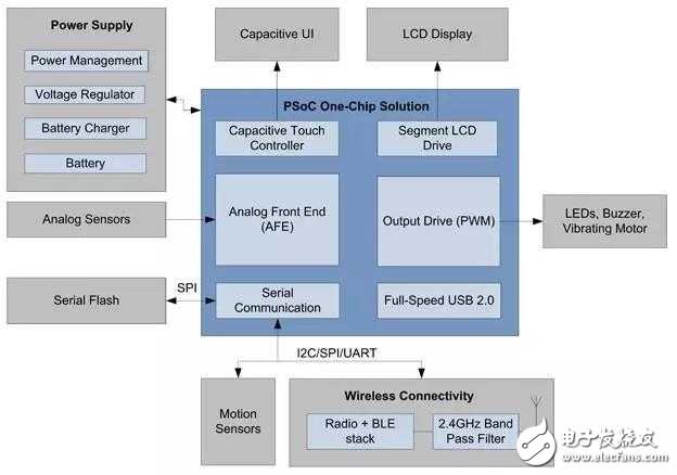 根据所采用的主处理器的类型,可以在单个处理器芯片中集成更多的外设功能。举例来说,大部分的PSoC器件都可以轻松集成电容式感应功能,并且无需单独的触摸控制器。图3给出了智能手表的方框图,这是第一代可穿戴设备的典型例子。