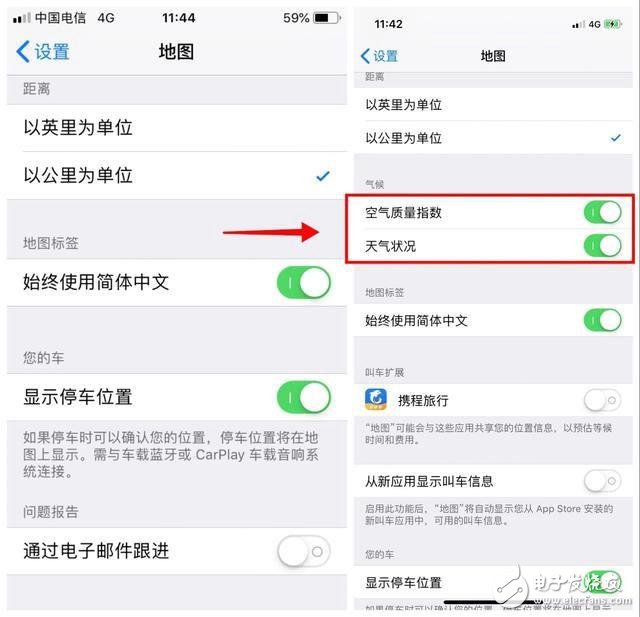 4、自带地图新增了空气质量指数、天气状况的关闭选项。