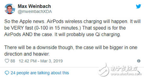 3月4号消息,据 PhoneArena 报道,苹果可能在3月25日的新闻发布会上发布 AirPods 2,XDA电视台主持人兼XDA门户网写手 Max Weinbach ,发布推文称,AirPods 2将支持无线充电,并且15分钟即可充满电量,并称 iOS 13 不支持黑暗模式,需等到 iOS 13.1。