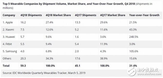 而小米和华为的数据相比2017年也有了很大的提升。小米的销量同比增长近45%,保住了第二名的位置。而华为则从2017年的460万台可穿戴设备增加到2018年的1130万次台,增长了147%。华为在可穿戴设备市场的巨大进步是由于Watch GT和FreeBuds 2 Pro等新产品以及许多华为和Honor智能手机与可穿戴设备捆绑在一起。