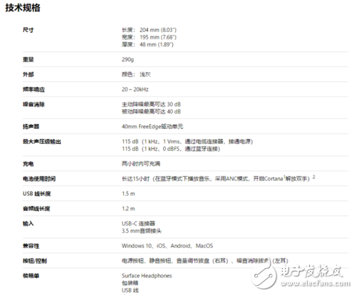 Surface Headphones无线耳机支持“Hey Cortana”语音唤醒,无需手动按下按钮即可进行音乐播放操控。耳机配备了8个麦克风,支持蓝牙4.2,可以与Surface笔记本产品配合使用,也可以用于其他移动蓝牙设备,包括iOS、安卓以及macOS设备等。Surface Headphones无线耳机的充电接口为USB-C,支持快充,用户只需充电5分钟便可获得1小时音乐续航。电池整体续航时间为15小时蓝牙使用或50小时插线使用。