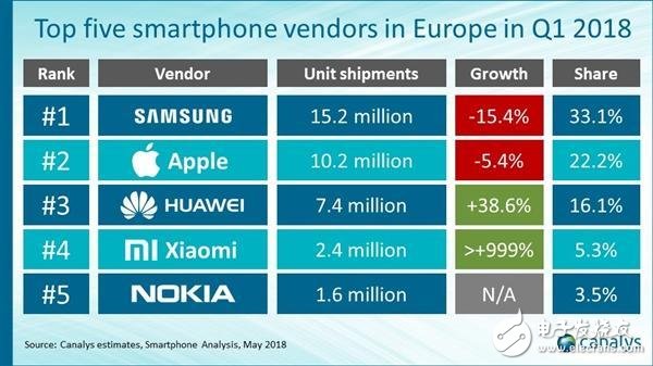 2018年5月10日消息,到了5月份,各个研究机构关于智能手机市场的分析报告都出炉了。日前,研究机构Canalys发布有关一季度欧洲智能手机市场的出货量报告。