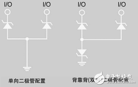 设计人员应尽可能选择单向二极管配置,因为它们在 负电压ESD冲击事件中的表现更好。负电压ESD冲击期间, 钳位电压将基于二极管的正向偏压(一般小于1.0 V)。反之, 双向二极管配置在负电压冲击期间提供的钳位电压基于反向 击穿电压,比单向二极管的正向偏压高。因此,单向配置能 大大减小负电压冲击期间对系统产生的压力。