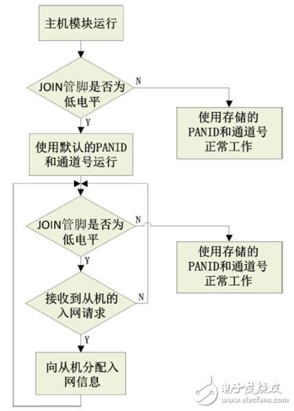 当JOIN管脚为低电平时,主机模块工作在组网模式,此时主机模块允许从机模块加入网络,当JOIN管脚变为高电平时,主机模块进入正常工作流程,此时从机模块不能再加入网络。