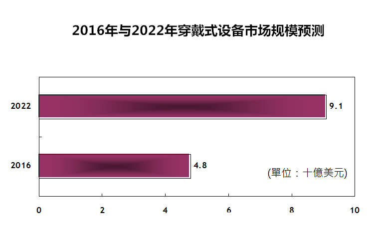 图一、2016年与2022年穿戴式设备市场规模预测