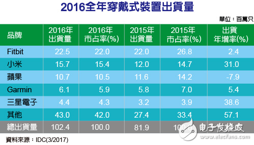 据IDC统计数据指出,2016全年穿戴式装置出货量已突破1亿只大关,达到1.02亿只,出货量年增率达到25%。在前五大品牌中,三星电子由于基期较低,出货年增率最高,达到38.6%;排名第二的小米由于基期较高,因此年增率表现不如三星,但也达到31%。不过,2016年穿戴式装置市场最值得注意的业者并非前五大品牌,而是被归类为其他的众多后起之秀,如李宁、Fossil、BKK等。