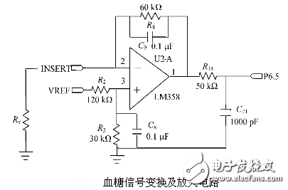 其次是温度检测电路,由于血糖测试是利用生物电化学反应,而影响该反应的重要因素是温度。在不同的温度下,葡萄糖氧化酶的活性不同。即使是相同血糖浓度的血液,采用相同的激励电压,在不同温度下,由葡萄糖氧化酶氧化产生的电流大小也不同。所以需要根据温度进行补偿以获得正确的血糖浓度值。当温度过高或过低时,葡萄糖氧化酶就会完全失去活性,此时血糖仪需要给出报警,提示用户仪表不能在该温度下进行操作,避免得出错误的检测值。