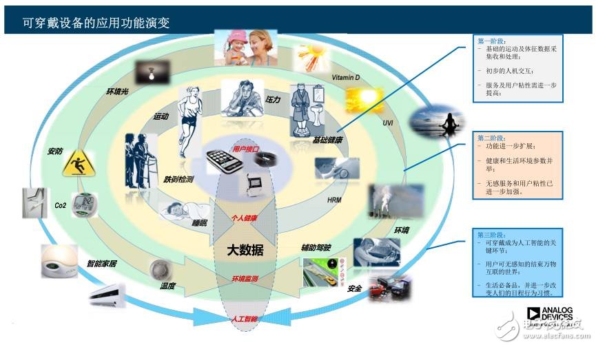 第一阶段,设备有基本的健康和运动监测功能。“在第一阶段ADI做了心率监测、运动检测等功能,而现在是如何将更多技术进行衍生、使设备同时达到更多的功能采集、提升用户的整体使用体验的阶段。”王胜表示。的确,经过这些年的发展,第一阶段已经不能满足用户对设备的更多功能需求。例如,人们会进一步希望知道跑步一公里和跑步五公里身体会出现哪些不同变化?经过一段时间的运动锻炼,除了步数的变化,另外心率、血压、体脂等其他更综合的身体指标发生了哪些变化?这将是下一阶段要完善的。