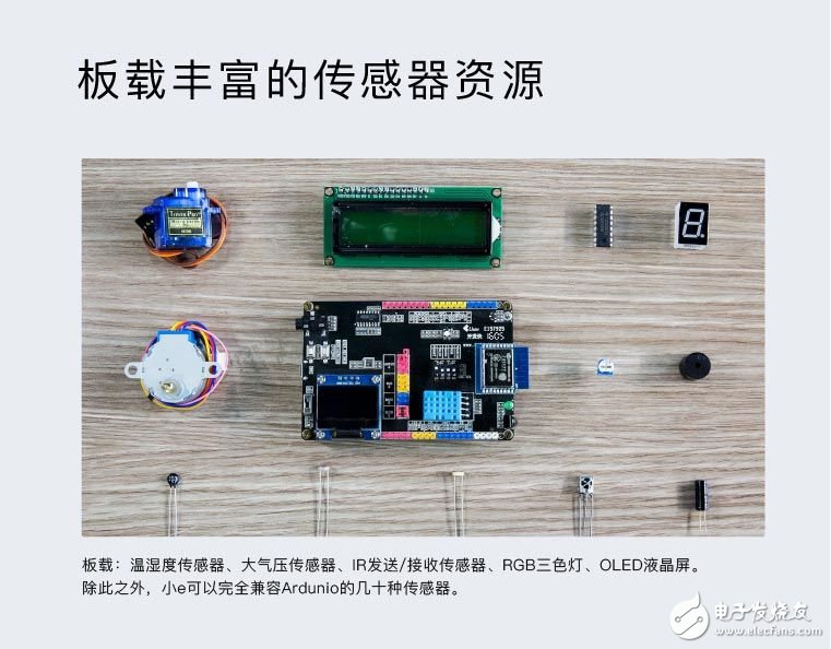 从众筹页面来看,小e有wifi和2G两个模式可选,板载现在常用的所有传感器,预留了全部标准