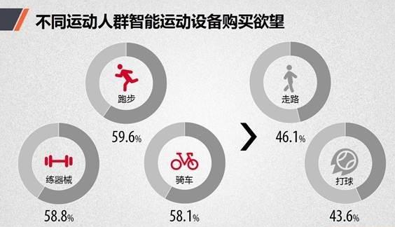 接下来,我们关注目前尚未购买可穿戴设备的人群,他们的购买潜力。跑步、练器械和骑车一族,共同跻身“最具购买欲望人群” 前三名。走路、打球这种大众运动人群,购买可穿戴设备的欲望,分别达到46.1%和43.6%。