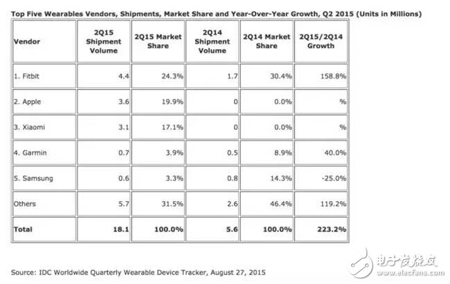 单从2015年第二季度的数据看,全球智能穿戴产品的出货量达到了1810万台,相比去年同期的560万台,增长了223.2%,除了苹果和小米的加入,Fitbit和“其它”类别里的增长也是很明显的,Fitbit从去年的170万台增长到440万台,增长158.8%;其它类别也从260万台增长到570万台,增长119.2%,翻倍有余;唯一下滑的是三星,原因可能是Gear 2销量增长乏力。