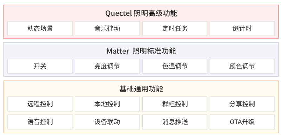 作为家居中数量最多、涉及区域最广的照明设备,Matter的出现解决了照明产品最基础的标准化功能定义,让不同品牌的设备能够在一个协议下被统一操控。而移远通信则是在此基础上,结合当代人居的特殊需求,对不同场景的产品功能和优势进行了深度开发,从基础通用、标准功能、高级功能三大层面全面升级。