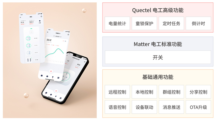 移远通信智能电工解决方案帮助用户在既定的APP上,对加入Matter设备的电工进行管理、自动化控制及OTA升级等操作。此外,电量实时统计、童锁保护、定时、倒计时等功能同样可以精准实现,为用户保障用电过程中的安全性及便捷性。